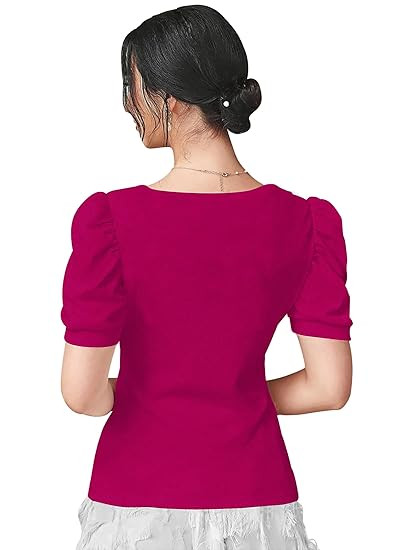Women's Polyester Slim Fit Puff/Balloon Bishop Sleeve Elegant Casual Tee Top