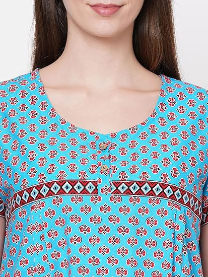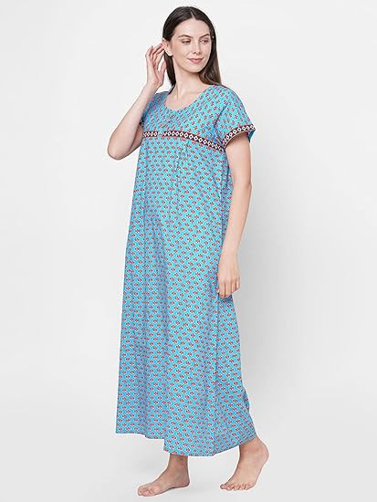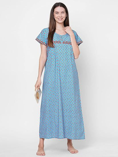 Technical inputs and fits : our technical team makes sure we provide you the smartest fits, yet the cuts are simple and functional for complete freedom of movement Design & Style : The Pull On Closure Long Nighty is Solid Printed Stylish Design. Neck Style: Round Neck ; Sleeves Type: Half Sleeves