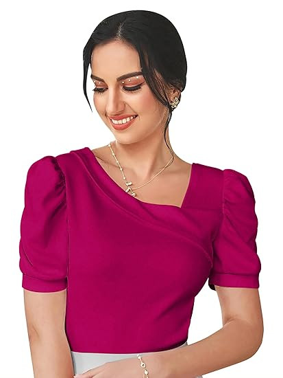 Women's Polyester Slim Fit Puff/Balloon Bishop Sleeve Elegant Casual Tee Top
